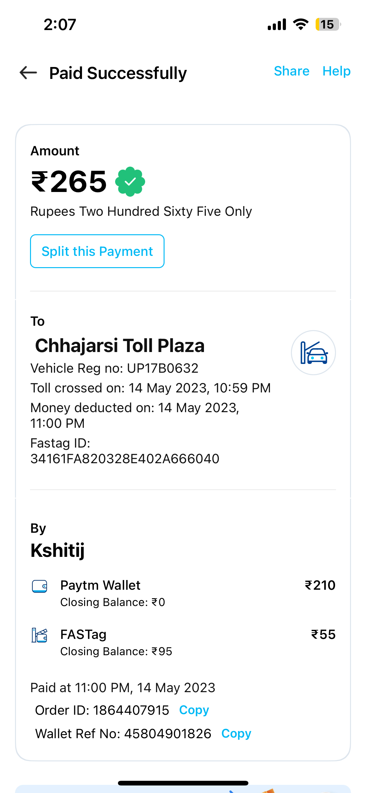 Paytm fastag se 165