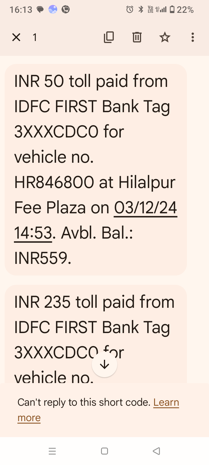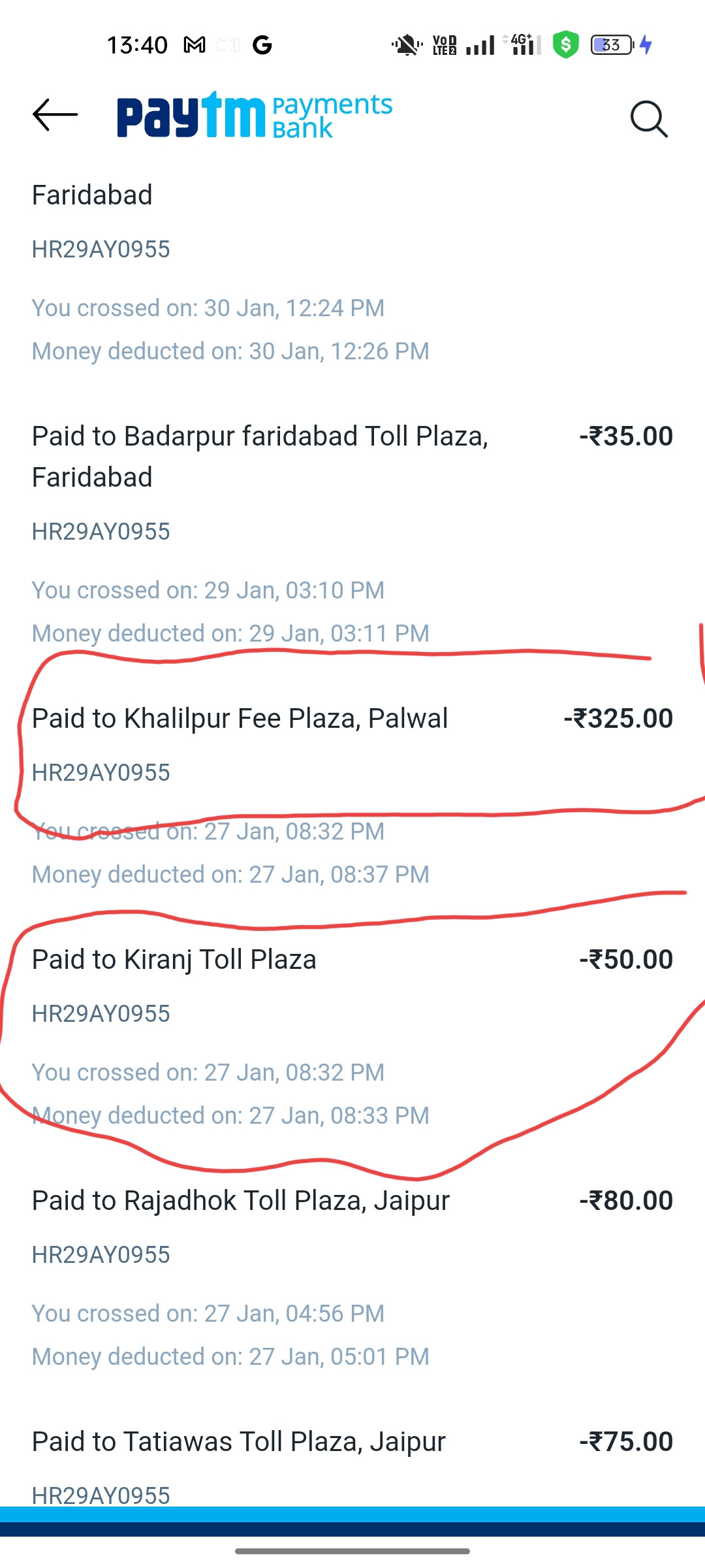 HR29AY0955 was crossing Palwal toll tax 27.01.24, dated at 8.32 pm. My toll was deducted twice time, that too wrongly 50 rs. And 325 rs why, the statement of which I am attaching to you.
